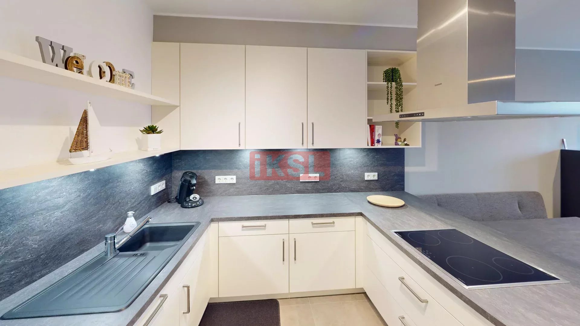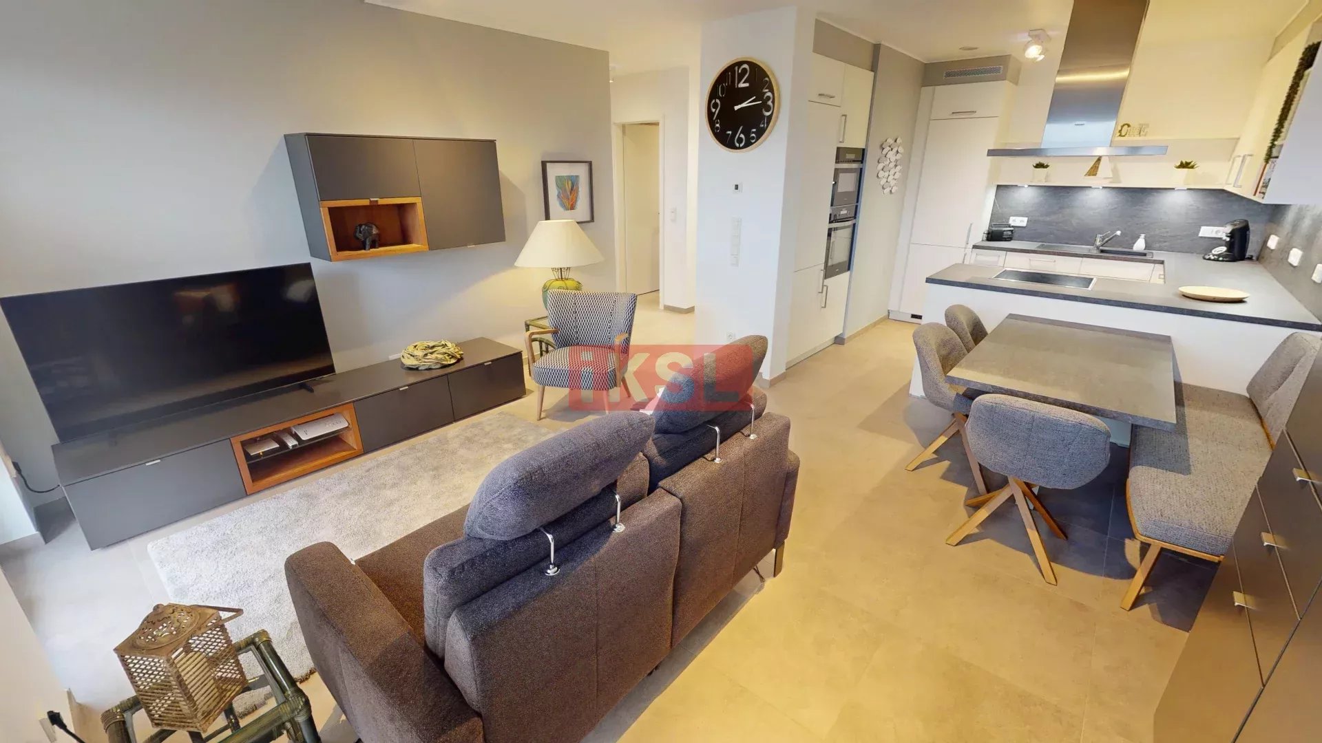 Hall d'entrée, salon avec cuisine équipée ouverte donnant sur une belle terasse et jardin, 1 chambre à coucher, salle de bains avec douche italienne et WC séparé, cave commune et 1 cave privative, 1 parking intérieur et 1 parking extérieur.